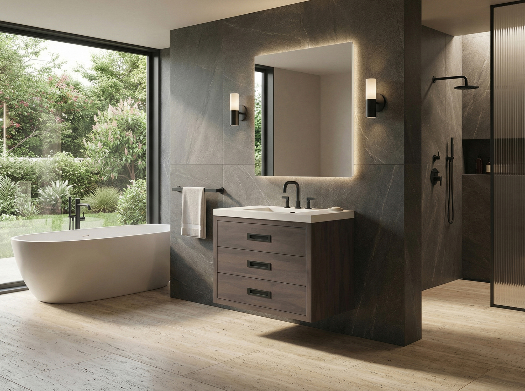 Basalt Concerto strikes a bold and industrial look with its deep grey coloring and subtle texture.