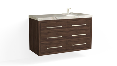 The ultimate material selection for a matte, fingerprint resistant countersink. Water drains to the perimeter of the drain cover before finding its way to the stainless drain pan hidden underneath. This top includes an overflow.