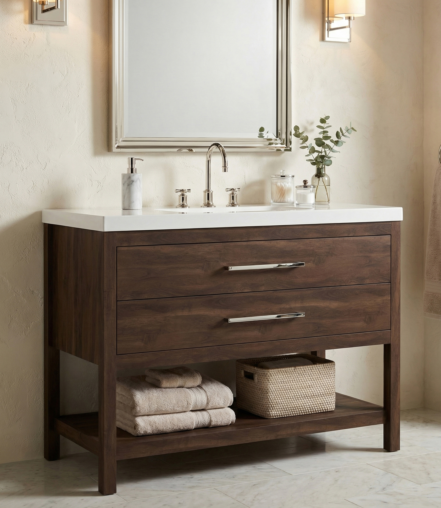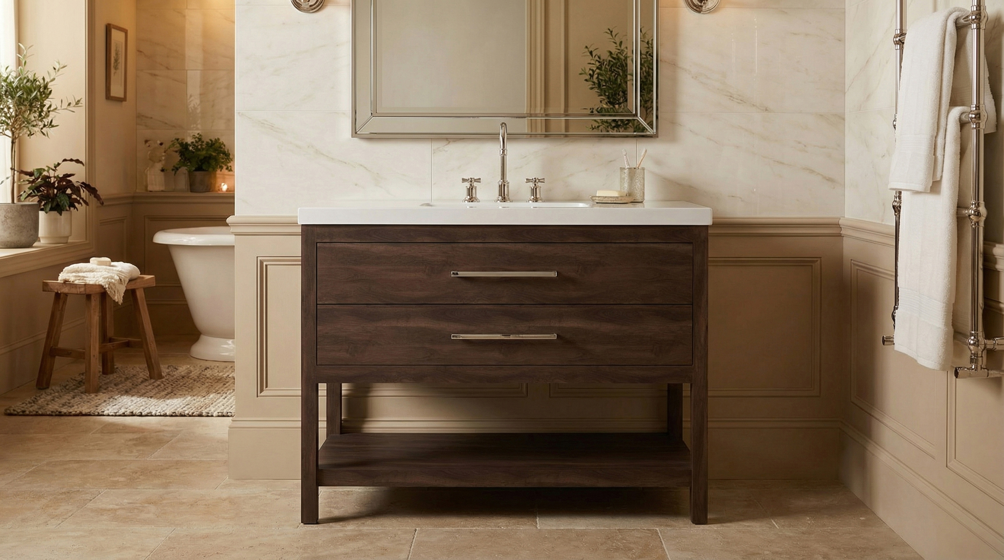 A classic design with fully inset details and open storage below. Our River vanity may look like pieces seen elsewhere but none are built with the same attention to detail.