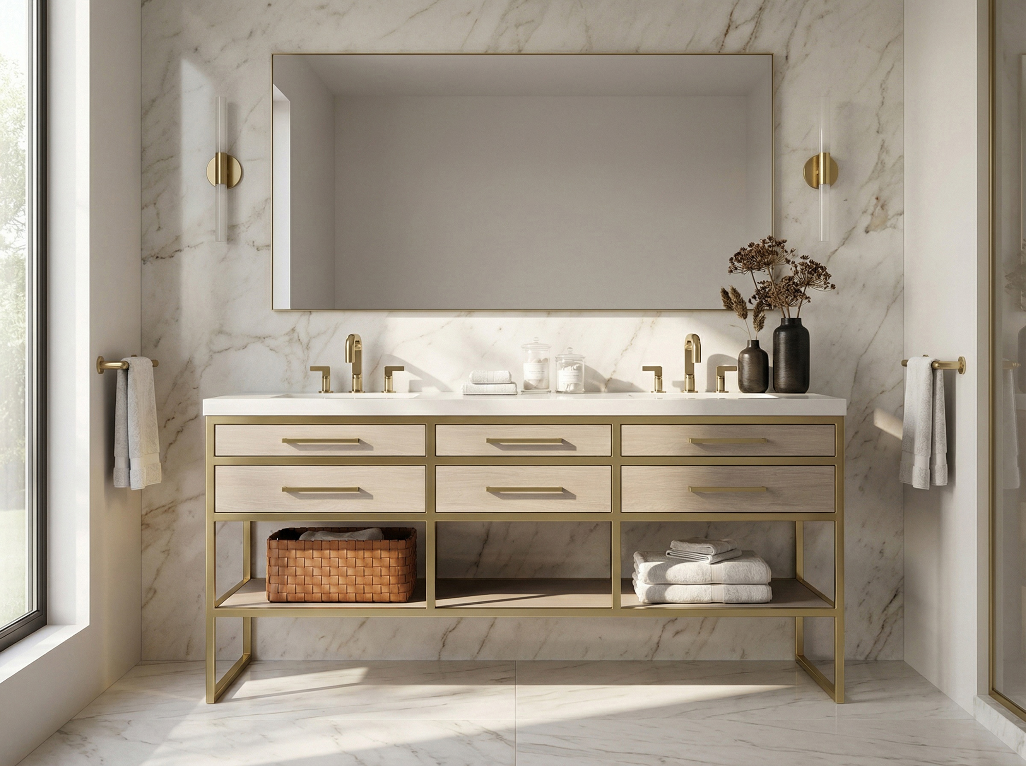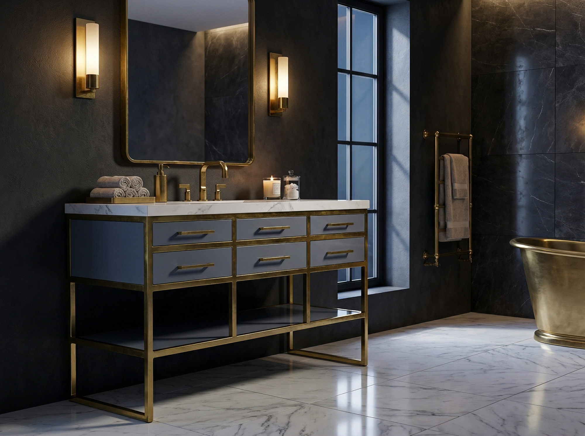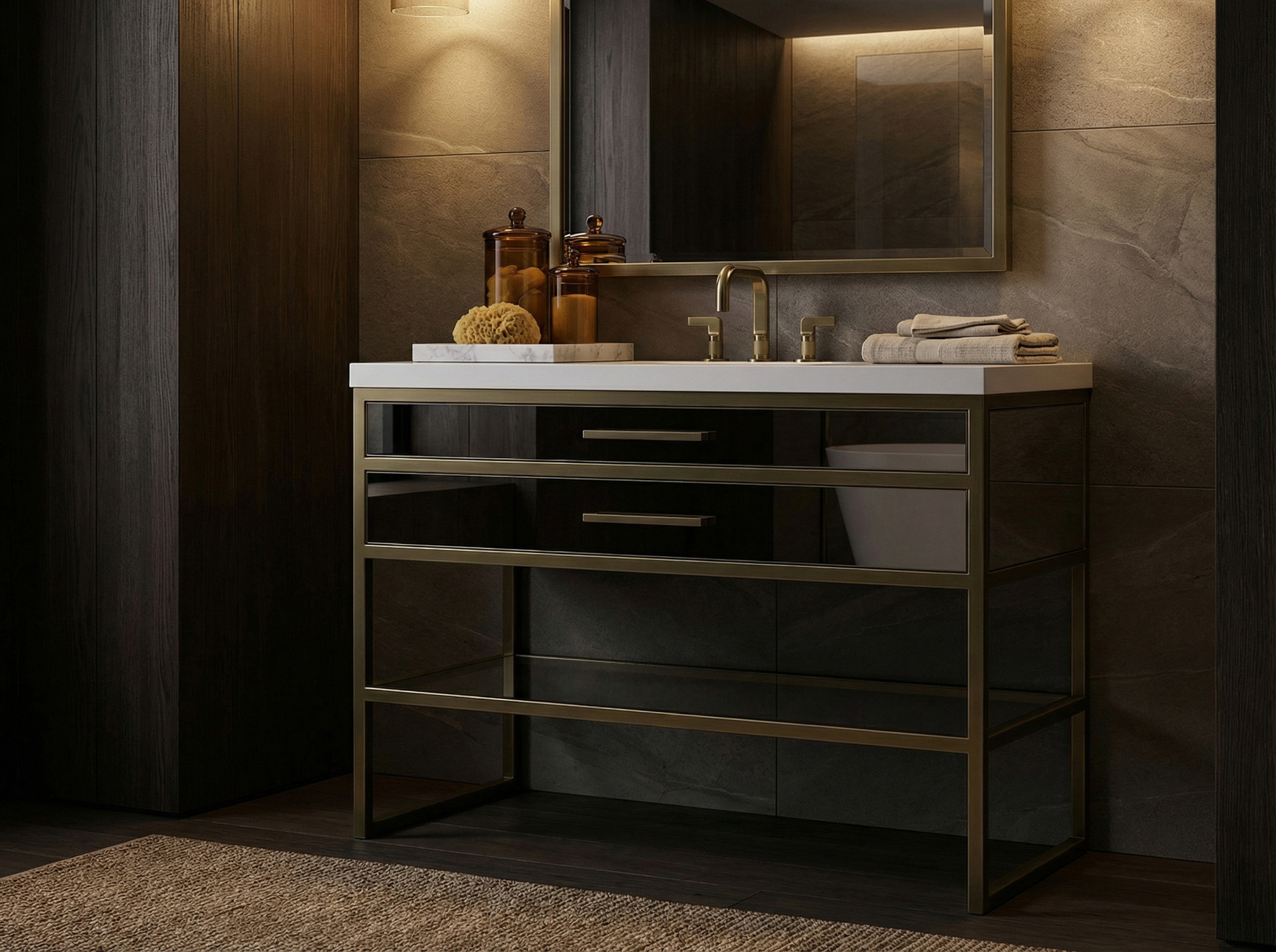 Made from solid brass tubing, Winston features fully welded details, sculpted corners and a working bottom drawer for storing bathroom essentials.
