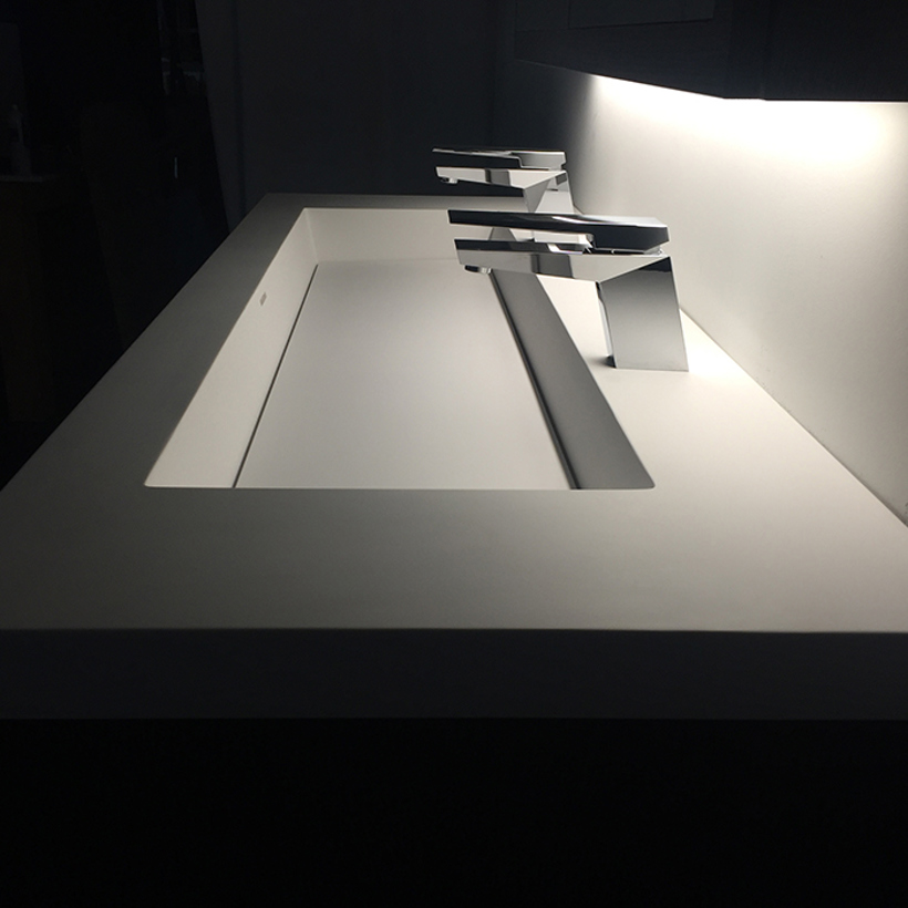4x Frame1-SN options shown here on a 405-0560 Avalon in C21 White Acrylic. Also shown, 4x 12DBAR-SN pulls, Guildstone countersink in white gloss with TROUGH54 sink shape, and 401-MC-4840 Medicine Cabinet with options LED downlight. Faucets courtesy of Dornbracht.