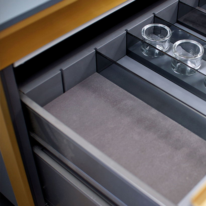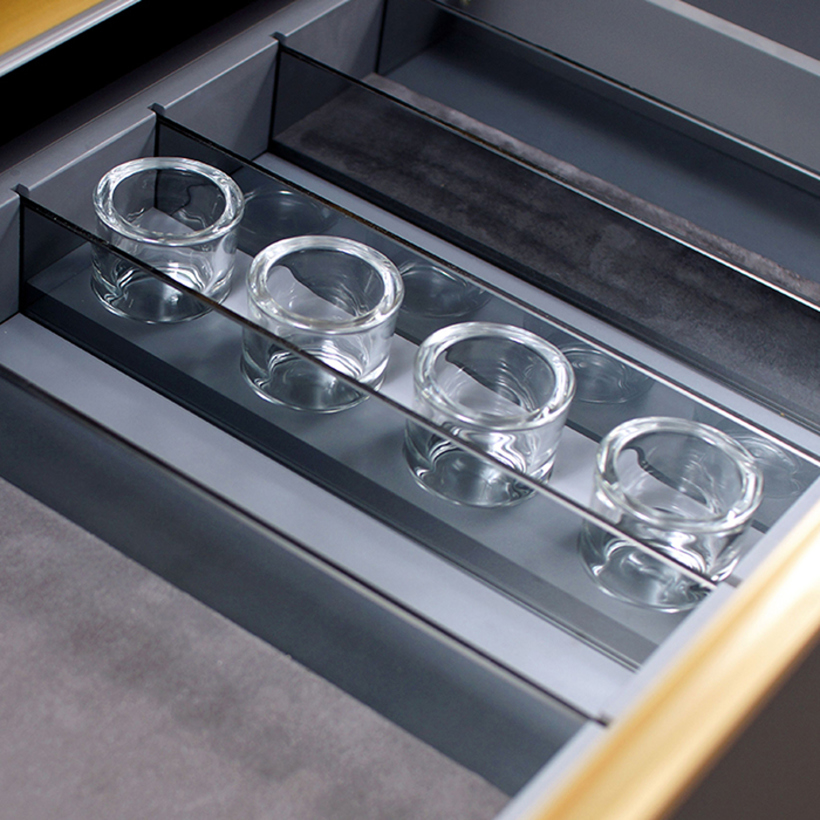 Protect sensitive small items by adding our leather insert to your glass dividers. These inserts can be moved to different positions in a drawer featuring our glass dividers. Suede comes in gray when added to a Gray Legrabox drawer and comes in Beige when added to a Wood Dovetailed Drawer.
