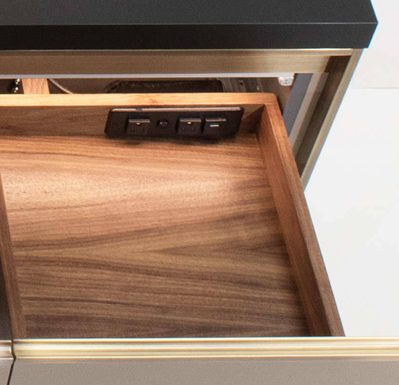 Add our Power Drawer option to convert almost any drawer into a charging station. Our Power Drawer includes 2 standard receptacles and 1 usb outlet mounted flush in the back of the drawer. Our special wire management system is included behind the drawer so you never have to worry about crimped cords, prohibited drawer movement, etc. We've thought it all out so you don't have to.