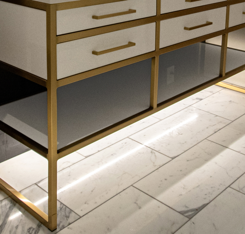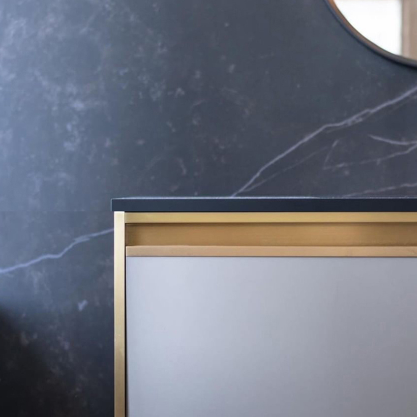 Guildstone is available in both matte and gloss finishes. To achieve our pristine matte finish, we sand our fabricated tops by hand. This allows us to be sure that the entire surface that could ever be seen or touched will be consistent to areas around it. This provides a soft touch, and little-to-no reflectivity, making it a great accent to all types of cabinet finishes.