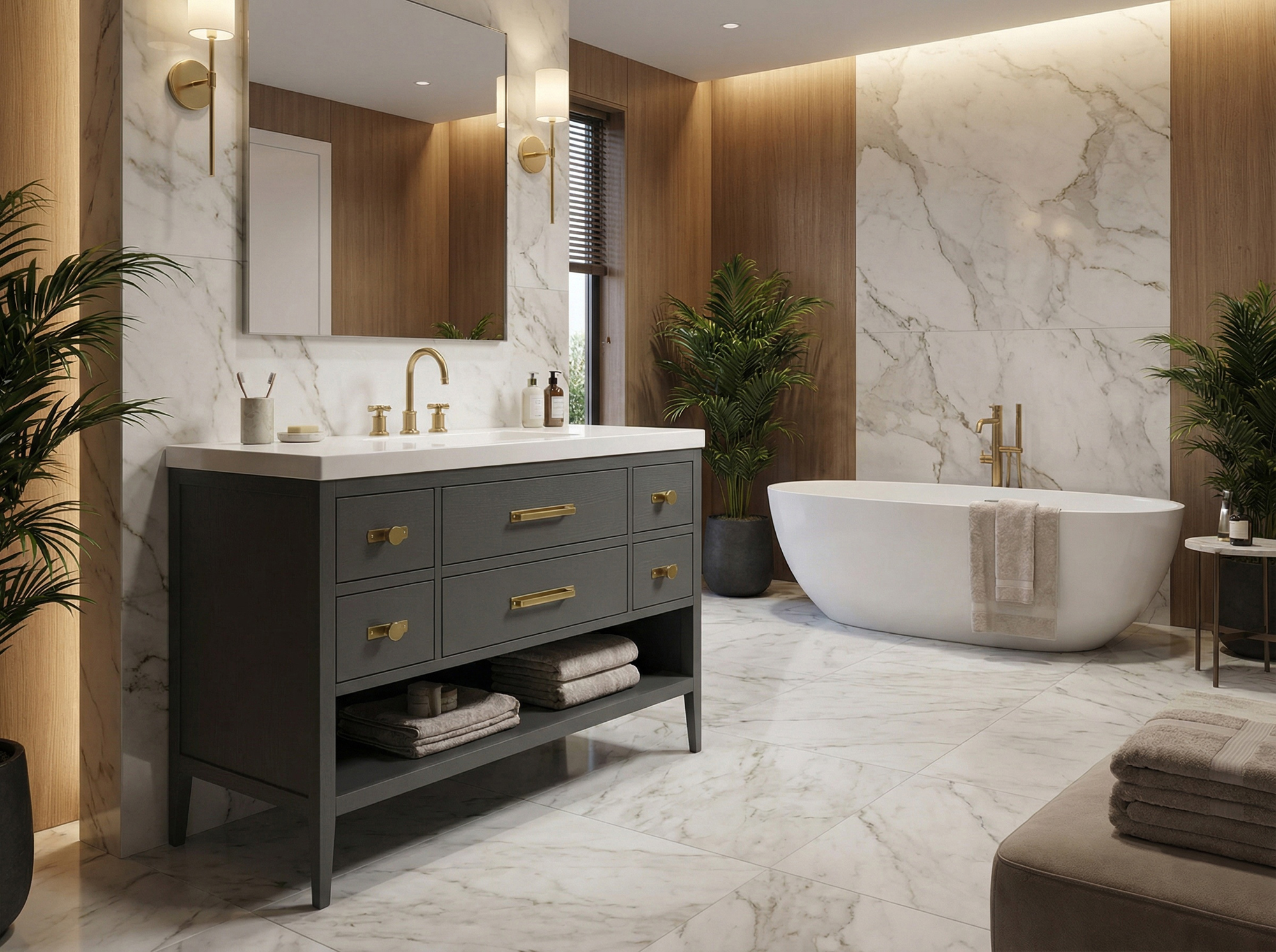 Our Calacatta Gold Quartz features a white background with wide grey highlights that are interspersed with unexpected golden glints. Our Calacatta Gold Quartz, distinguished appearance, pays homage to a marble which has been held in high esteem since ancient times.