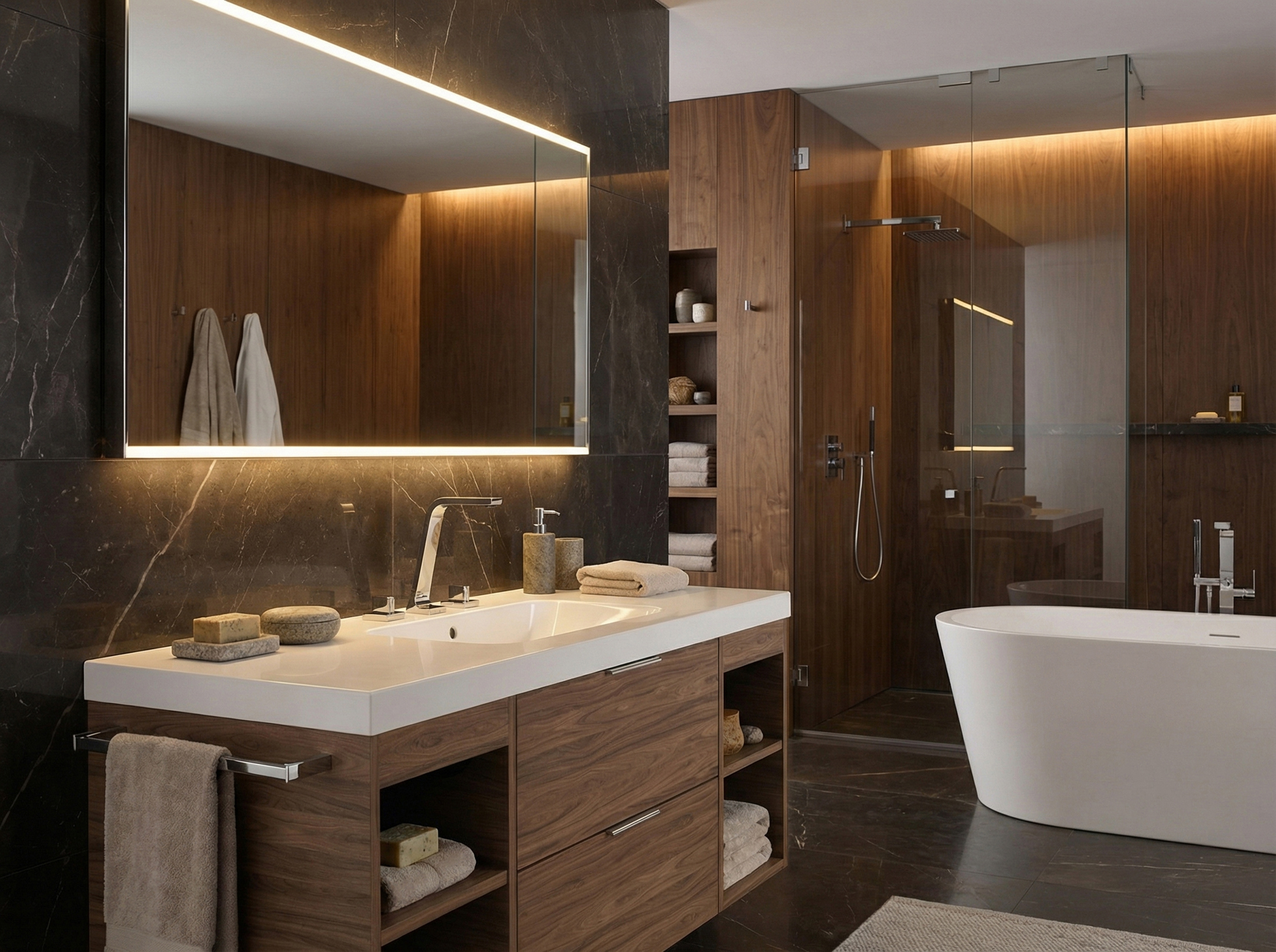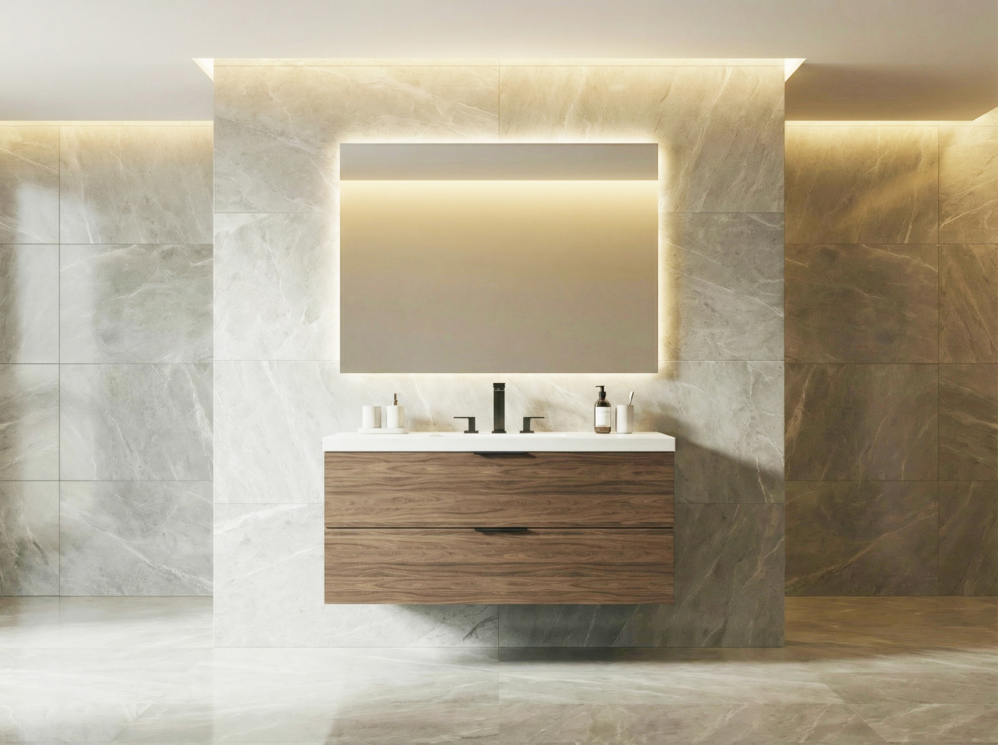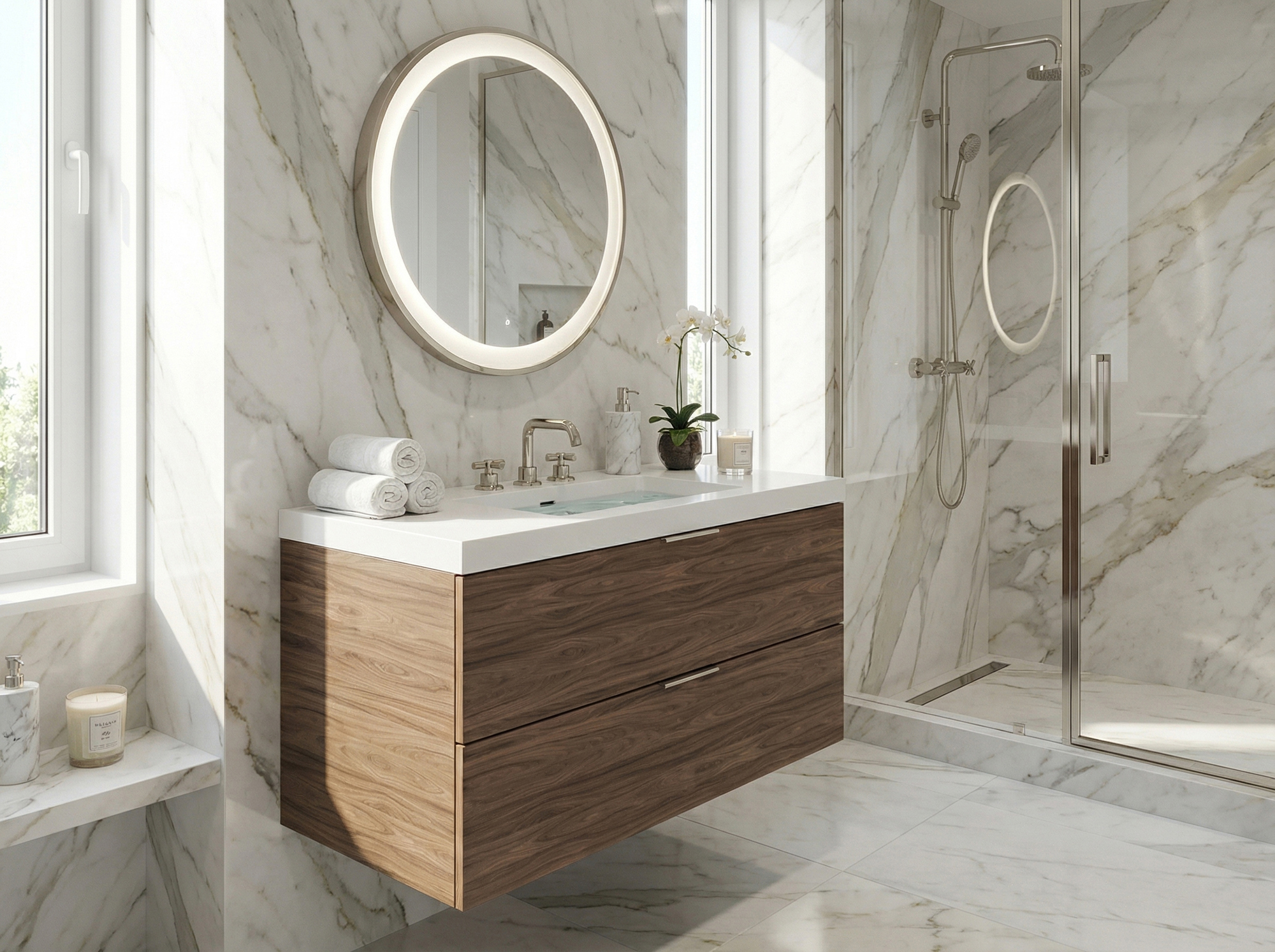Our gloss finish is polished by hand to a perfect finish. We don't use any top coat material which is likely to yellow over time. Because Guildstone is solid throughout, it can be polished over and over again making it the ultimate material for bathroom countertops.